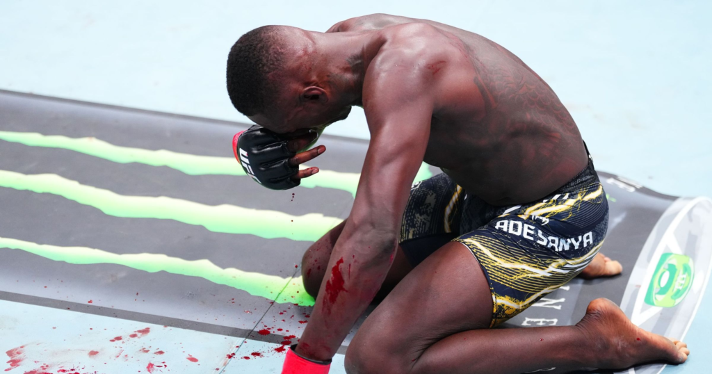 Cuando la pelea se vuelve física y va al suelo, Adesanya sufre